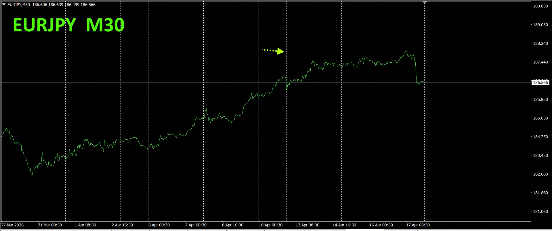 EURとJPYのベクトル方向を比較すると、JPYが上に向いていて、EURは逆に下をむいている、今後のEURJPYは、下降気味になると考えられます。