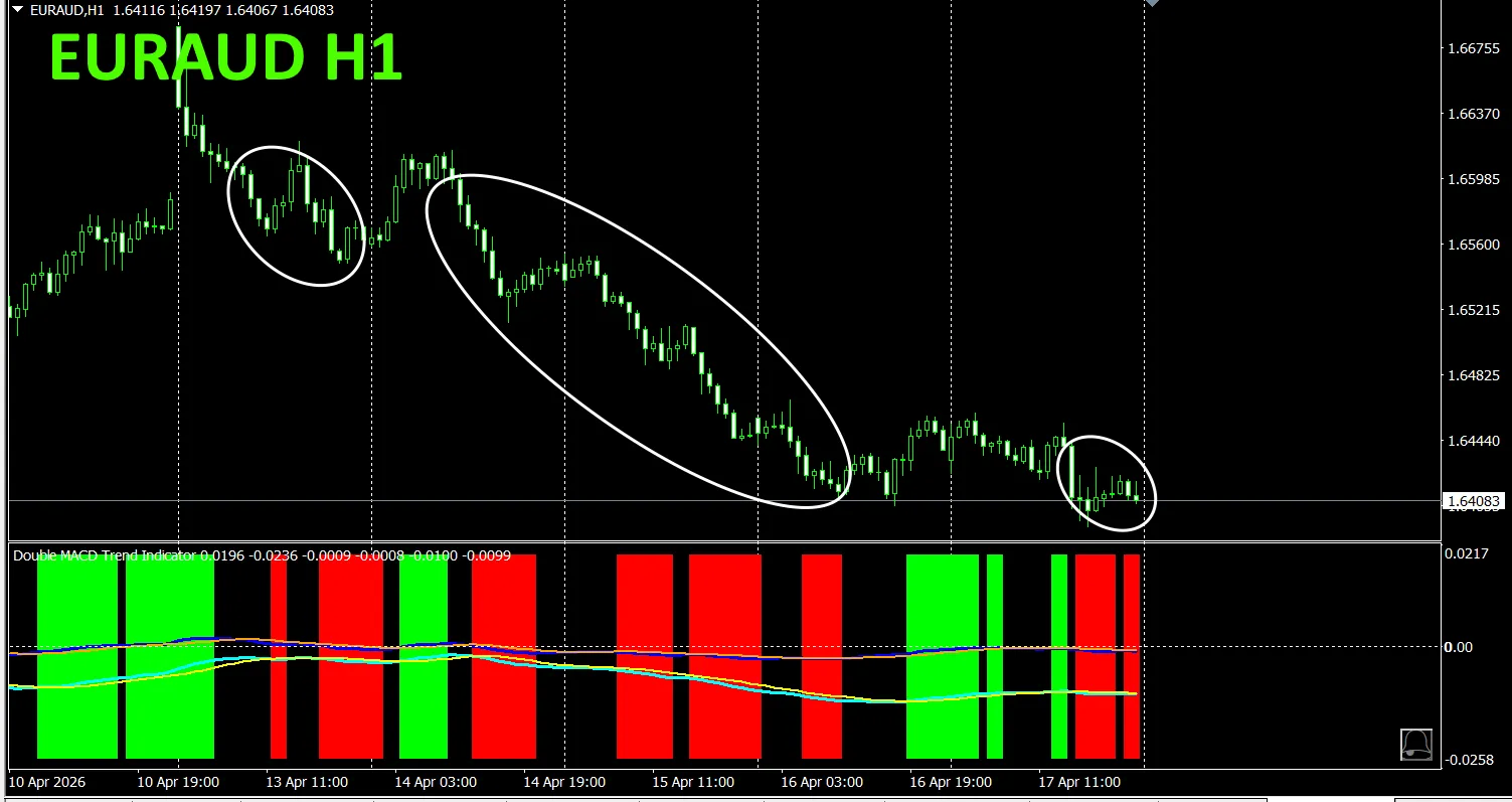 「Dual_MACD_Trend_Indicator」では、緑色のゾーンなら買い、赤色のゾーンなら売り、それ以外ではトレードしないという単純なルールに従うだけです。