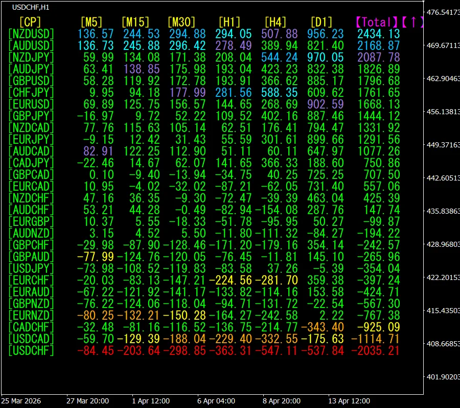[Total]で数値の降順に並んでいます。一番上にあるNZDUSDは、全ての時間足で青色系の表示色になっています。しかも、Total数値が2434.13で、大きいプラスの数字になっています。NZDUSDに上昇トレンドが発生していることが示唆されます。