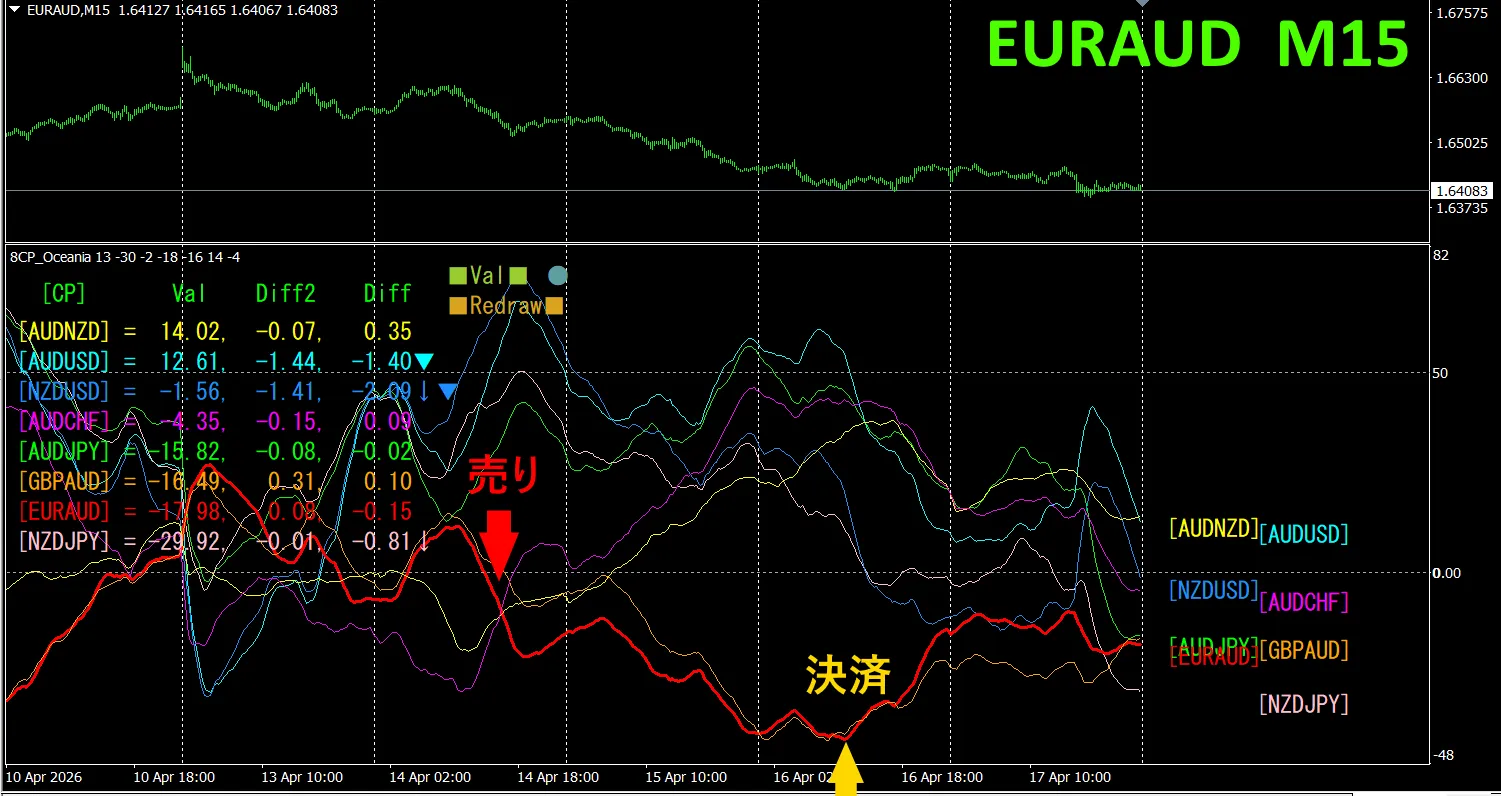 上半分は、EURAUDの15分足チャートです。下半分は、「8CP見える化インジケータ」によるものです、赤色のグラフがEURAUDに相当します