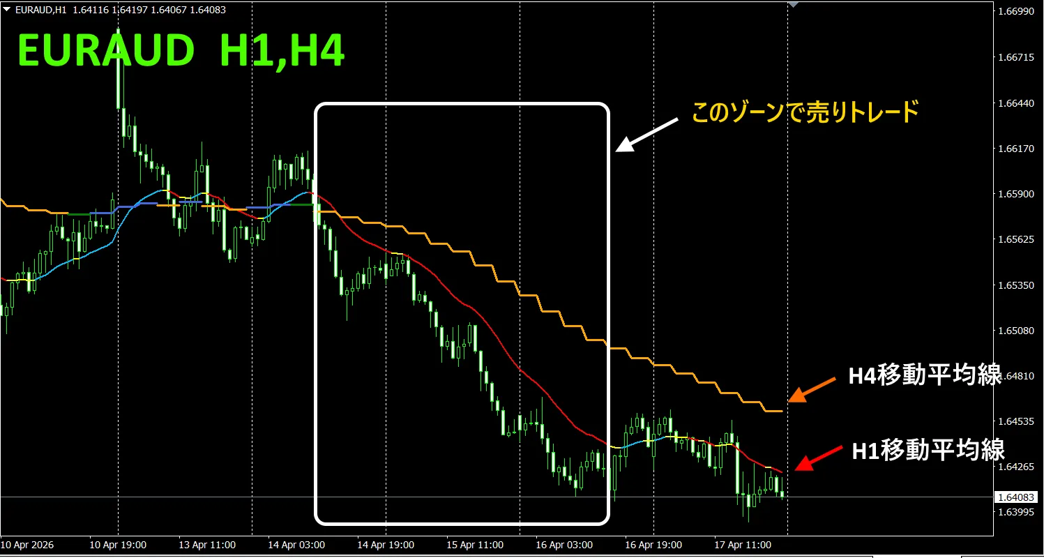 一例として、EURAUDの1時間足チャートに、4時間足の移動平均線を同時に表示させてみました。