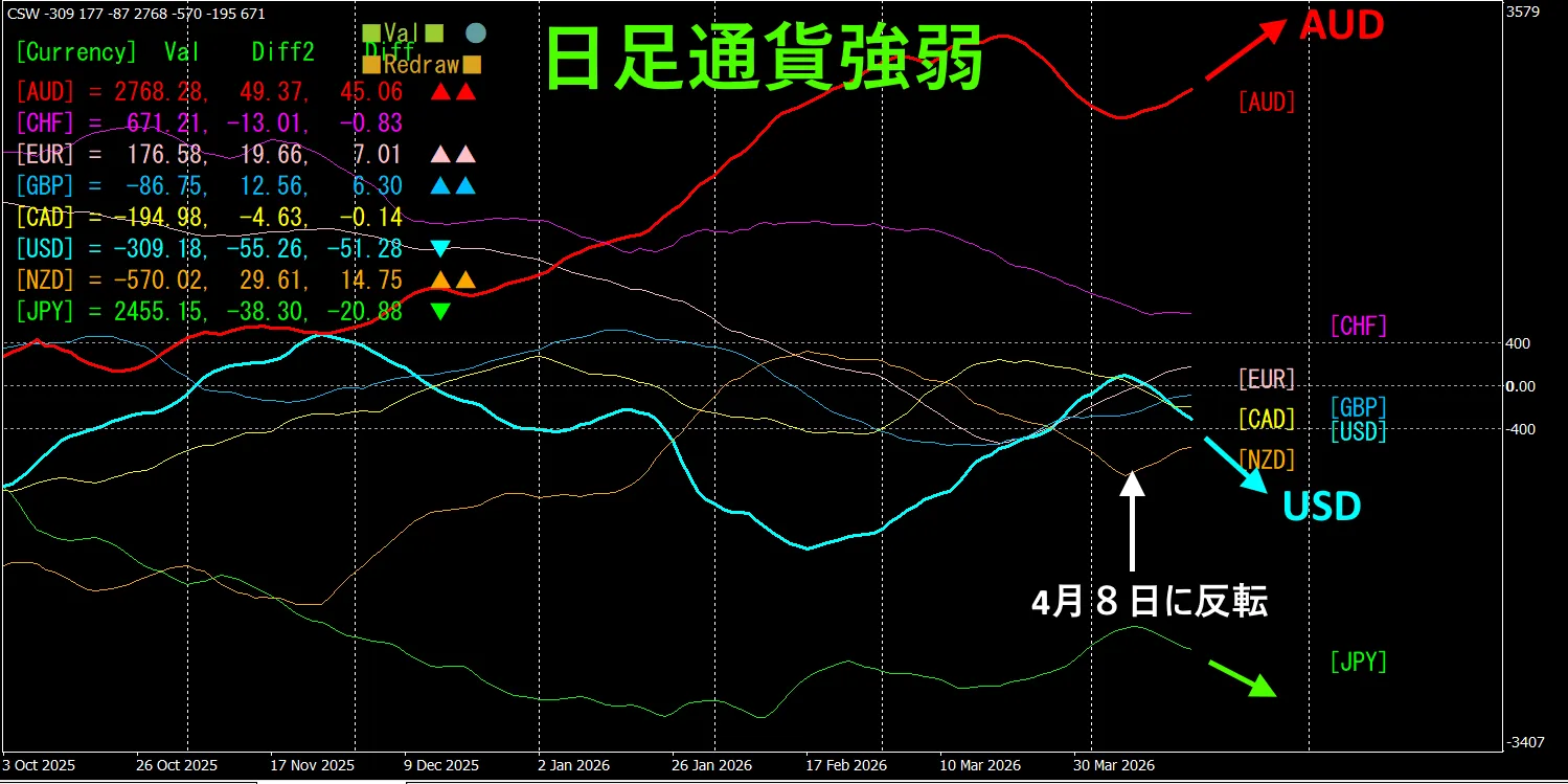 と記述しました。その後、時が経過し、AUDが再び強くなってきました。日足での通貨強弱の話ですが、AUDが強く、USDが弱くなってきたので、もはやAUDUSDの売りポジションを持つ意味がなくなりました。