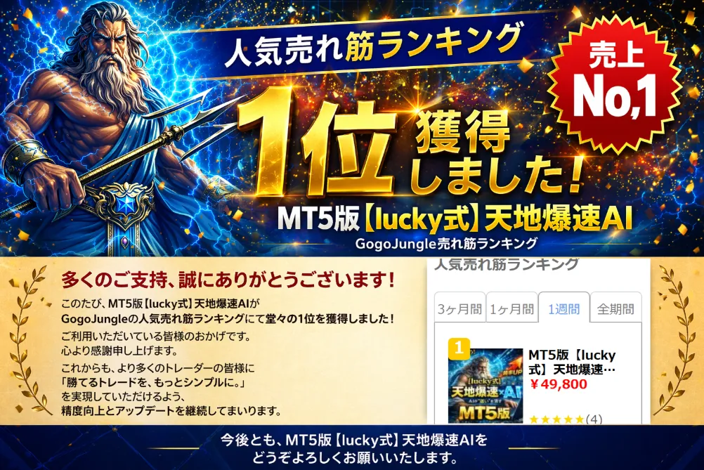 【ご報告】波をもぎ取る!MT5版【天地爆速AI】人気売れ筋ランキング1位を獲得しました!