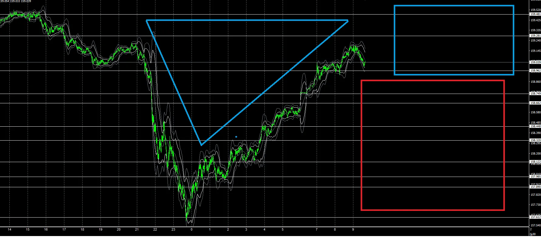 上げたモノは下がりますので、今日は赤□ゾーンの下落か、そのまま上昇した場合は青□ゾーンに入って行く流れかなとみています。