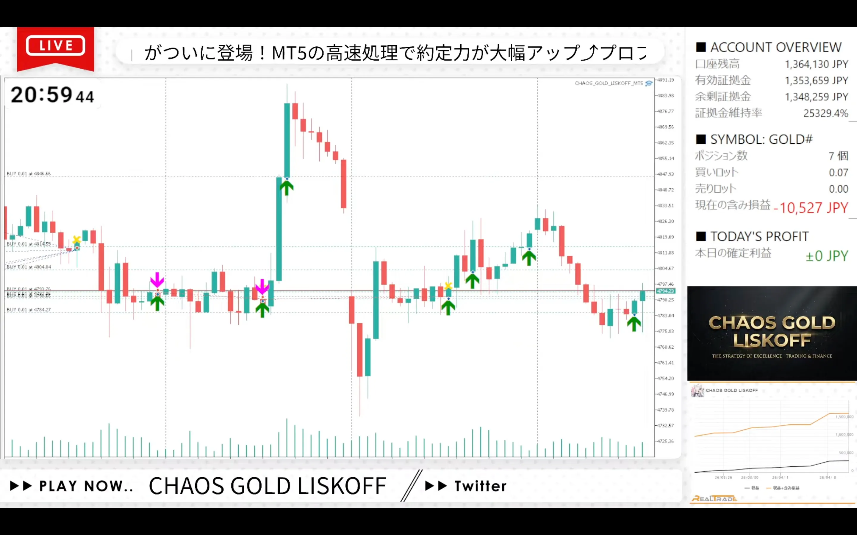 CHAOS_GOLDは本日、日本時間4時・18時・21時のエントリー枠で計7本の買いポジションを構築。エントリー価格は$4,814 / $4,804 / $4,793 / $4,784 / $4,797 / $4,790 / $4,774付近にばらついています。現在の含み損は-10,527円、まだ含み損を抱えたままの状況です。