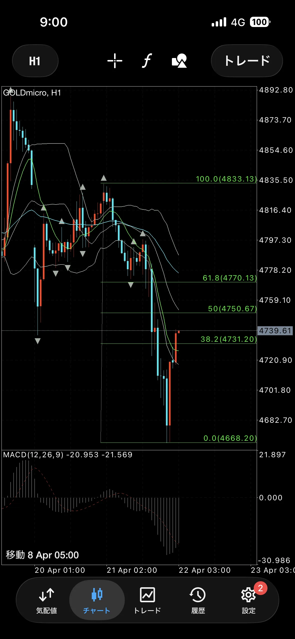 こちらの起点4668付近を下抜けるか、抵抗帯での陰線アウトサイドを待つ形となります。