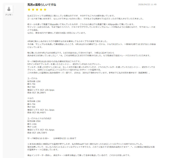 鬼速AIのレビューに共通しているのは「自作の検証用インジケーターを作成し、過去数年本当に勝っていることを確かめた」という内容です。
