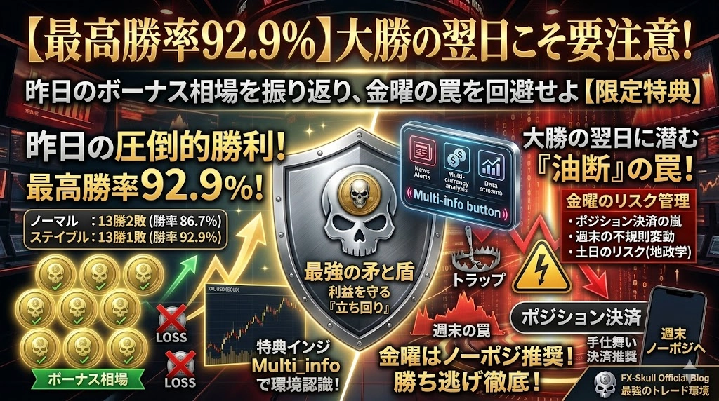 当ブログで連日お伝えしている通り、EA追加購入者様にお配りしている特典インジケーター『Multi_info button』を活用し、指標前のレンジや危険な時間帯を避けて「おいしい所だけの勝ち逃げ」を徹底していたユーザー様は、この数字よりもさらに高い勝率と安定した利益を残せているはずです。