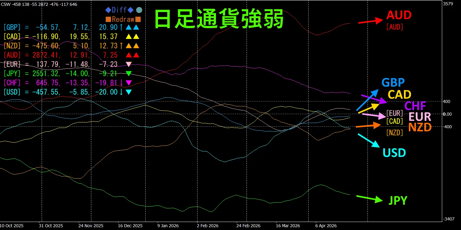 日足の通貨強弱グラフ、4時間足の通貨強弱グラフを順に見ていくことにします。