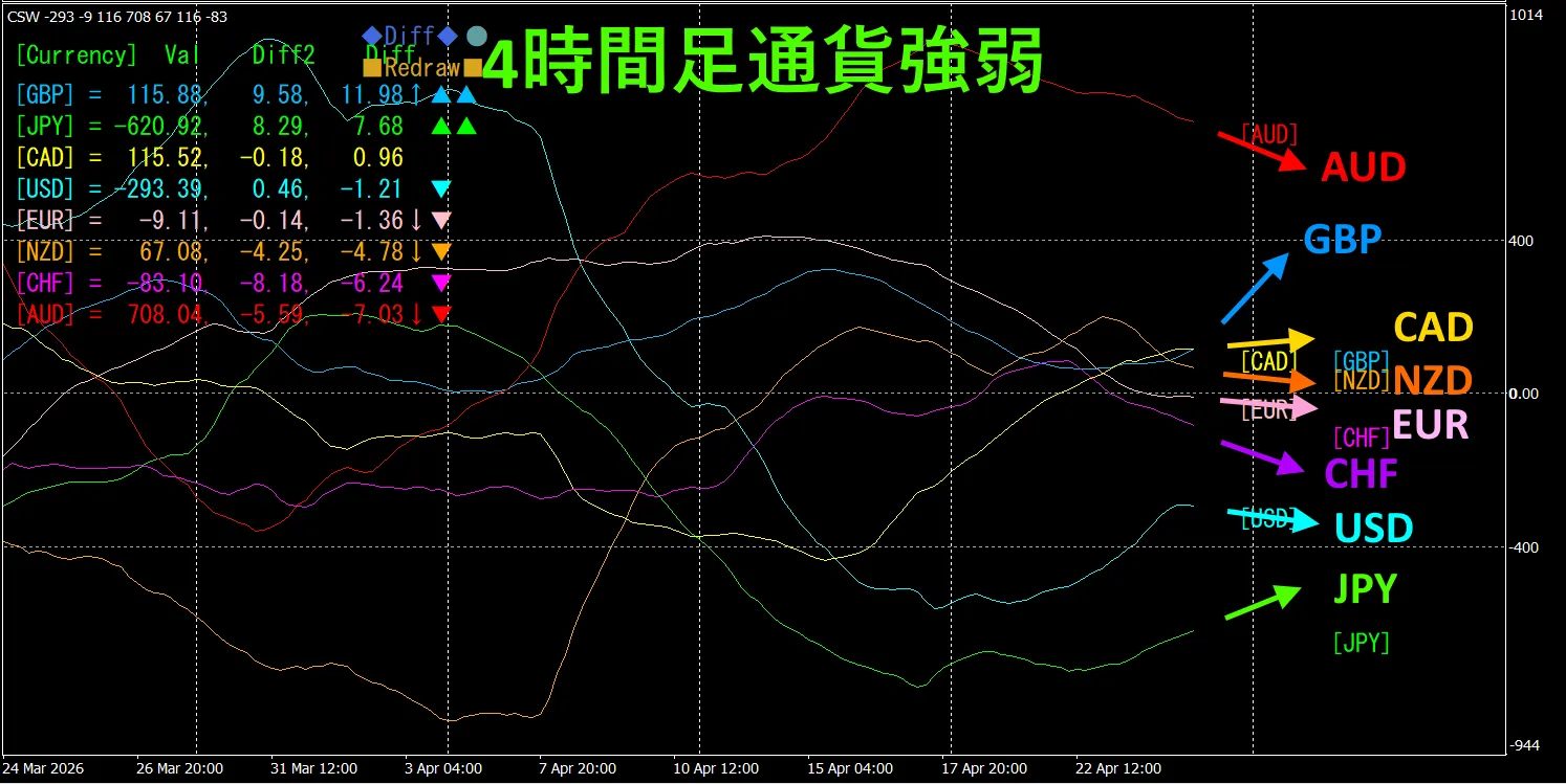 4時間足では、GBP、JPYが上向きに、AUD、CHF、NZD、EUR、USDが下向きになっています。CADの向きは水平になっています。
