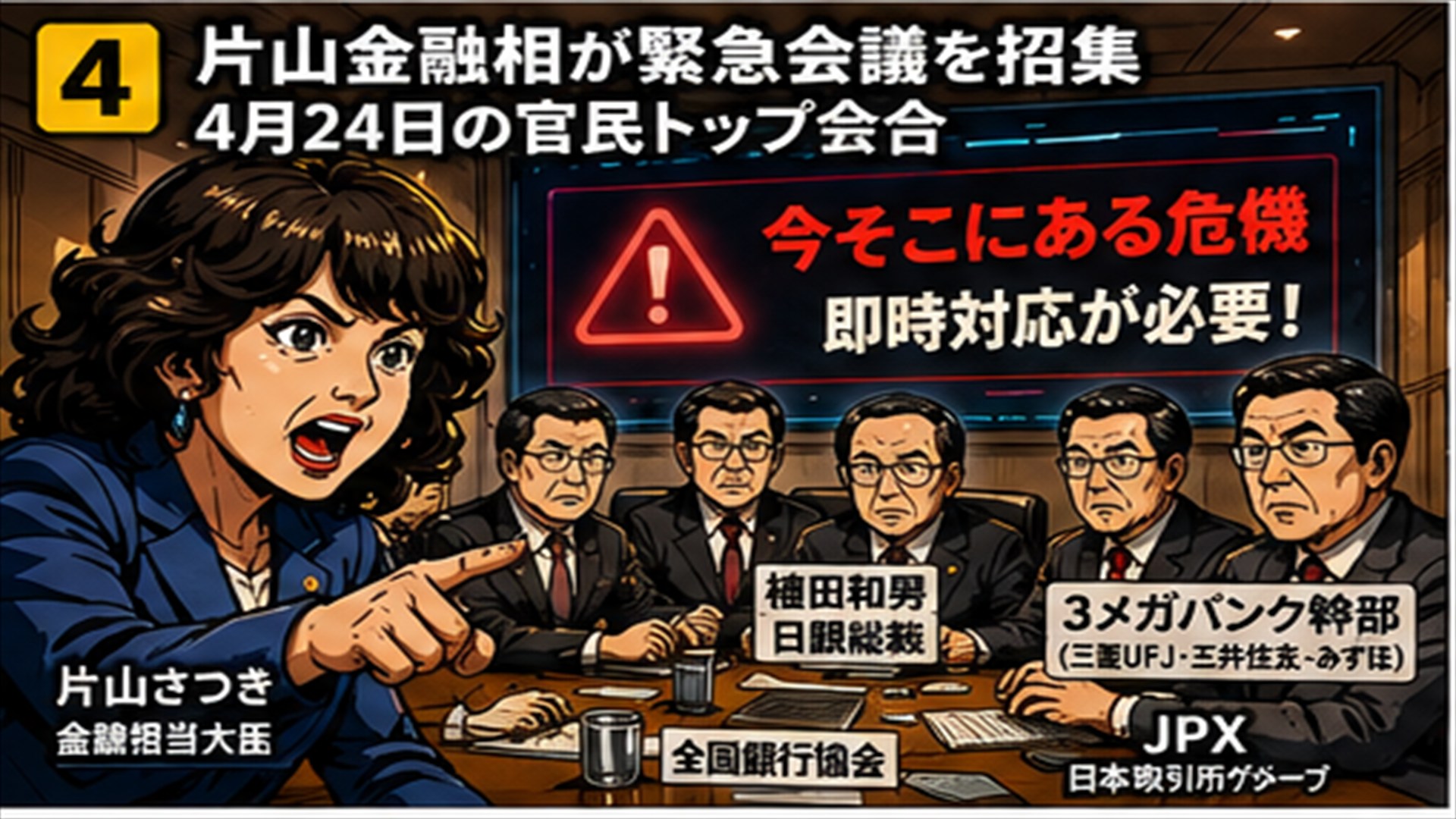 片山さつき金融担当大臣が本格的に動き出したのは2026年4月24日。 日銀総裁、3メガバンク(三菱UFJ・三井住友・みずほ)の幹部、全国銀行協会、日本取引所グループ(JPX)などと緊急官民連携会議を開催しました。 Mythos発表からわずか約2週間半という異例のスピード対応。