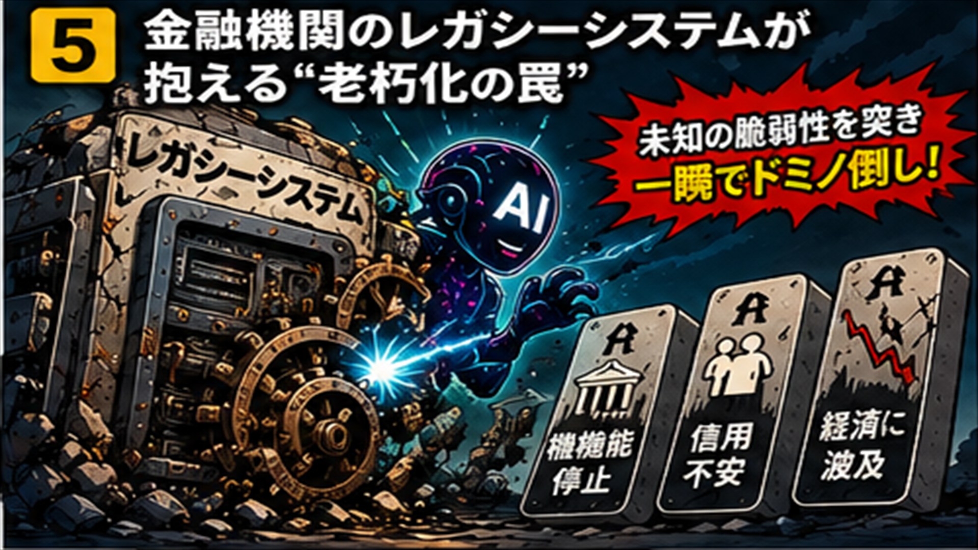 なぜ金融分野で特に問題視されるのか?日本の金融機関はレガシーシステム(古い基幹システム)が多く、未知の脆弱性を突かれたら影響が大きいからです。