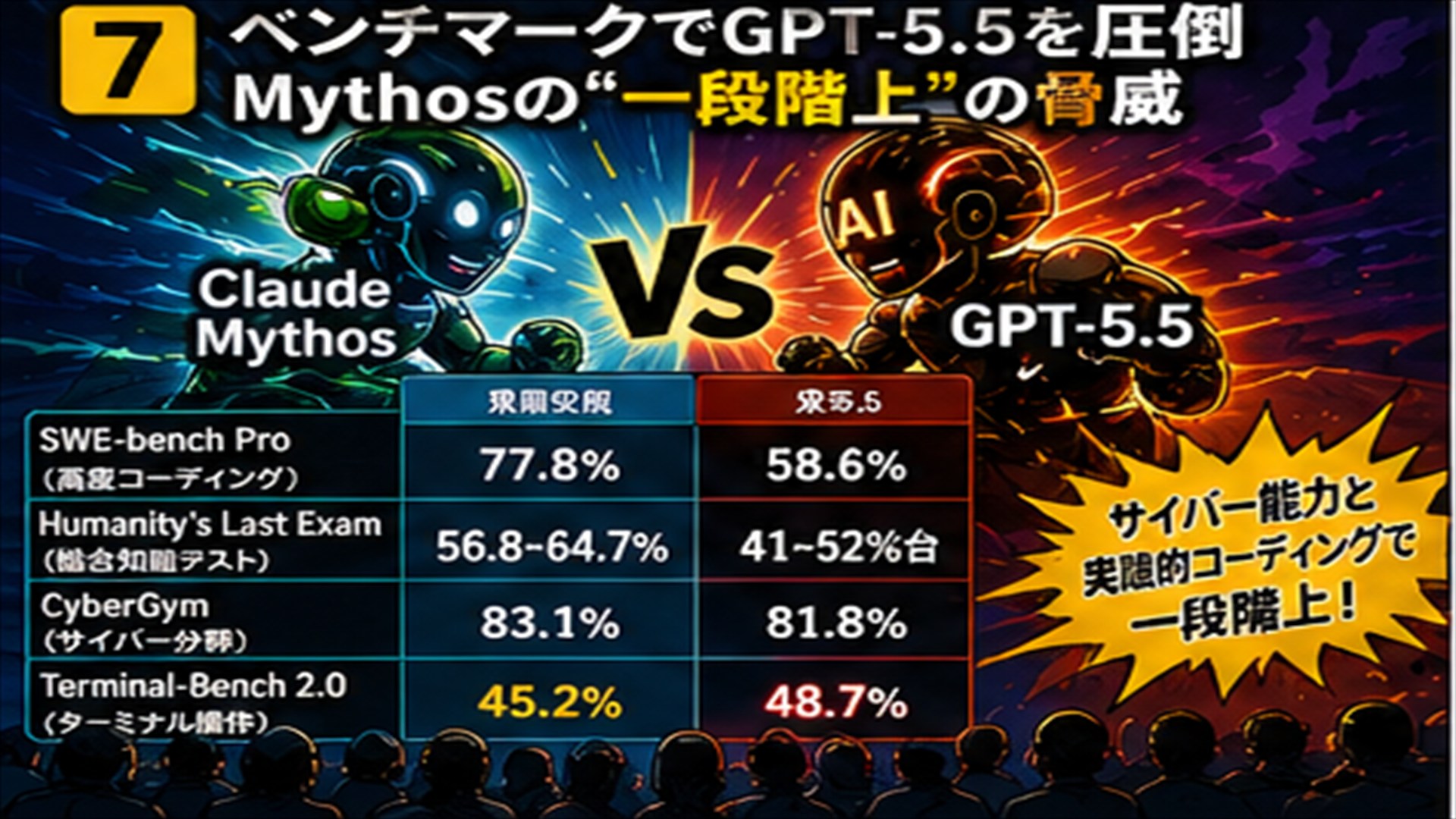 特にサイバー分野(CyberGym 83.1%対81.8%)と実践的コーディングで明確に「一段階上」。 ただしTerminal-Bench 2.0(ターミナル操作)ではGPT-5.5が僅差勝利と、用途によって優位性が分かれます。Anthropic自身が「汎用モデル」と位置づける通り、サイバー能力はコーディング全般の飛躍の「副産物」。