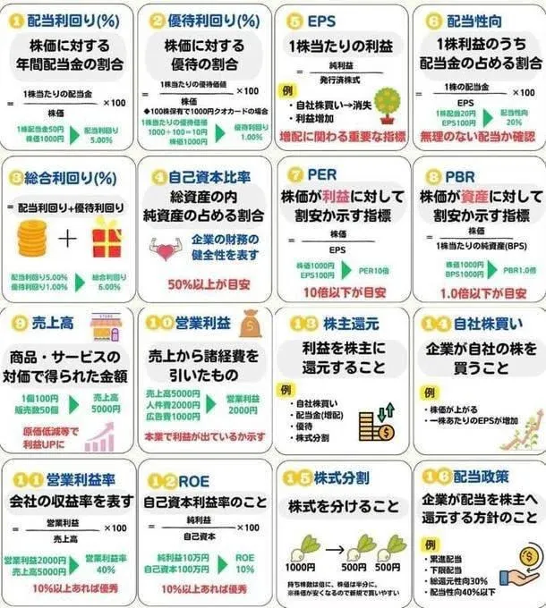 1.配当利回り(%) — 配当利回り(Dividend Yield)とは:株を買った後、会社が毎年いくら配当をくれるかの割合(家賃利回りのようなイメージ)。