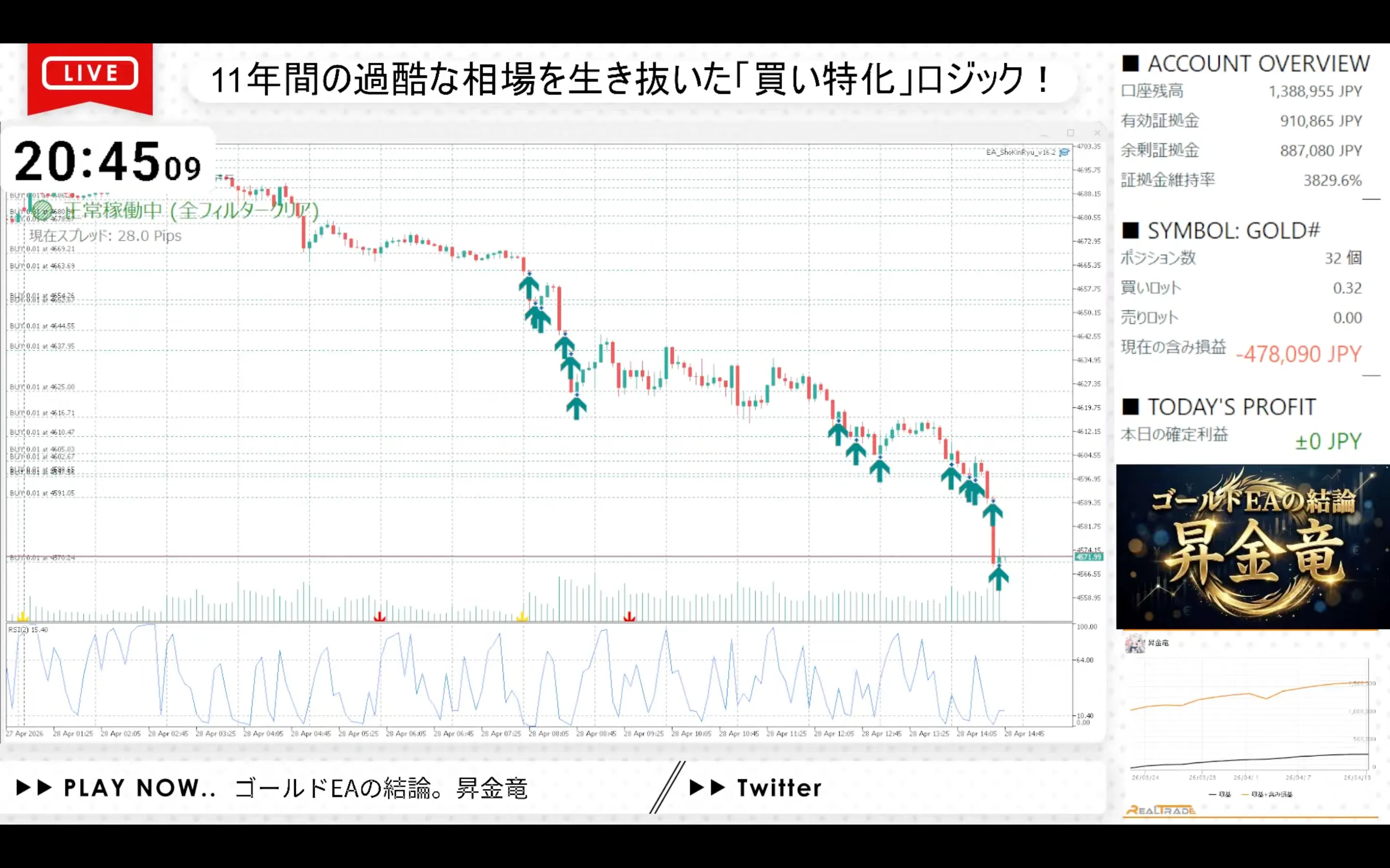 本日の昇金竜は確定利益±0円。前日終了時点の10ポジから一気に32ポジまで増加し、含み損は-478,090円まで膨らみました。$4,705付近からの一方的な下落に対し、RSIエントリーが連続発動して$4,720〜$4,570のレンジでナンピン群を構築する1日となりました。