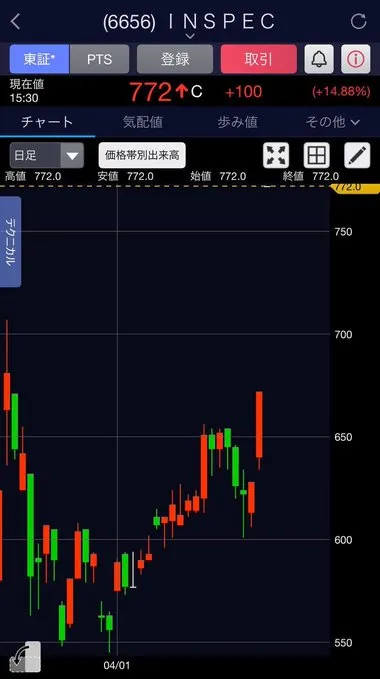 Today, Инспек(銘柄コード:6656)はストップ高(14.88%の上昇)となり、終値は772円となりました。
