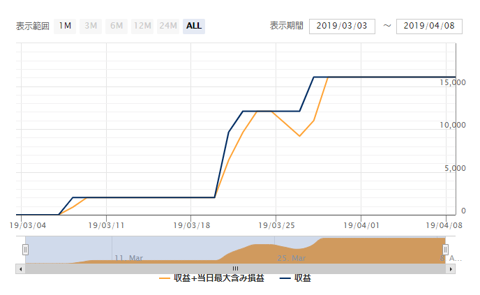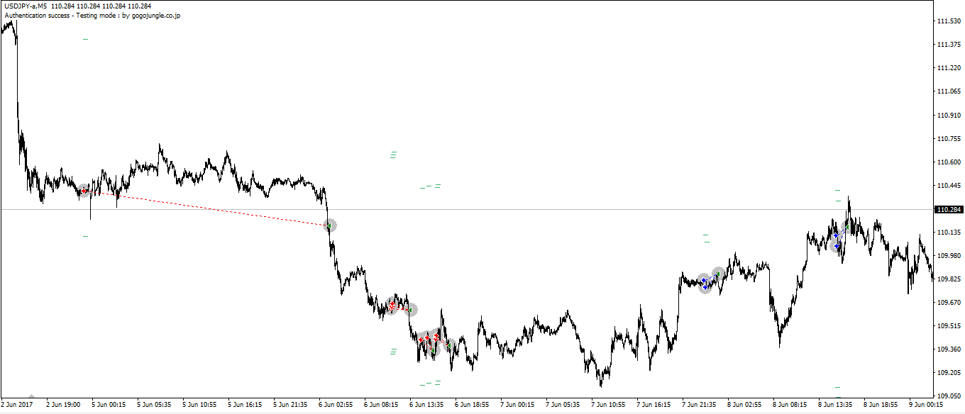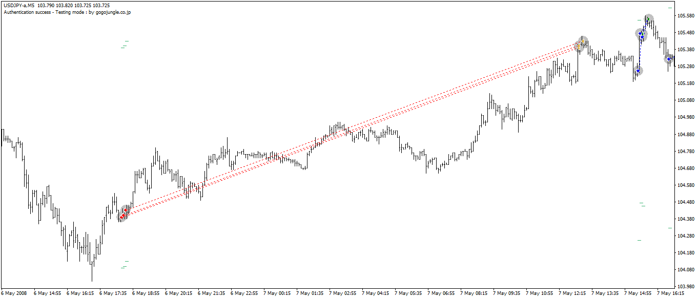 レンジ相場時にエントリーをして、想定よりも逆の方向に進むと最大で3ポジションまでナンピンするようです。基本的にはポジションを取ってから短期間でクローズしています。