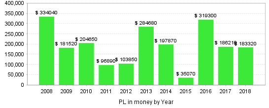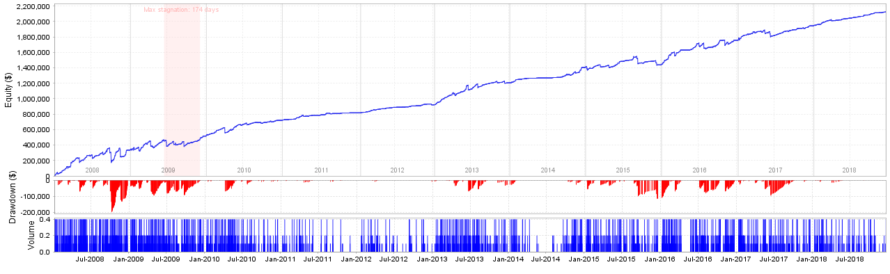 バックテストの損益チャートを見ると、2008年後半から2009年にかけて一時的に大きな損失が出しているようですが、それ以上に利益も右肩上がりに伸びています。2011年からは安定して利益を増やしています。2015年から2017年にかけて含み損が出てますが、やはりそれ以上に利益は伸びて続けています。2018年は損失もなく順調です。口座管理に気をつけていれば大きなリターンを期待でき、「ピンチの後にチャンスあり」だといえます。