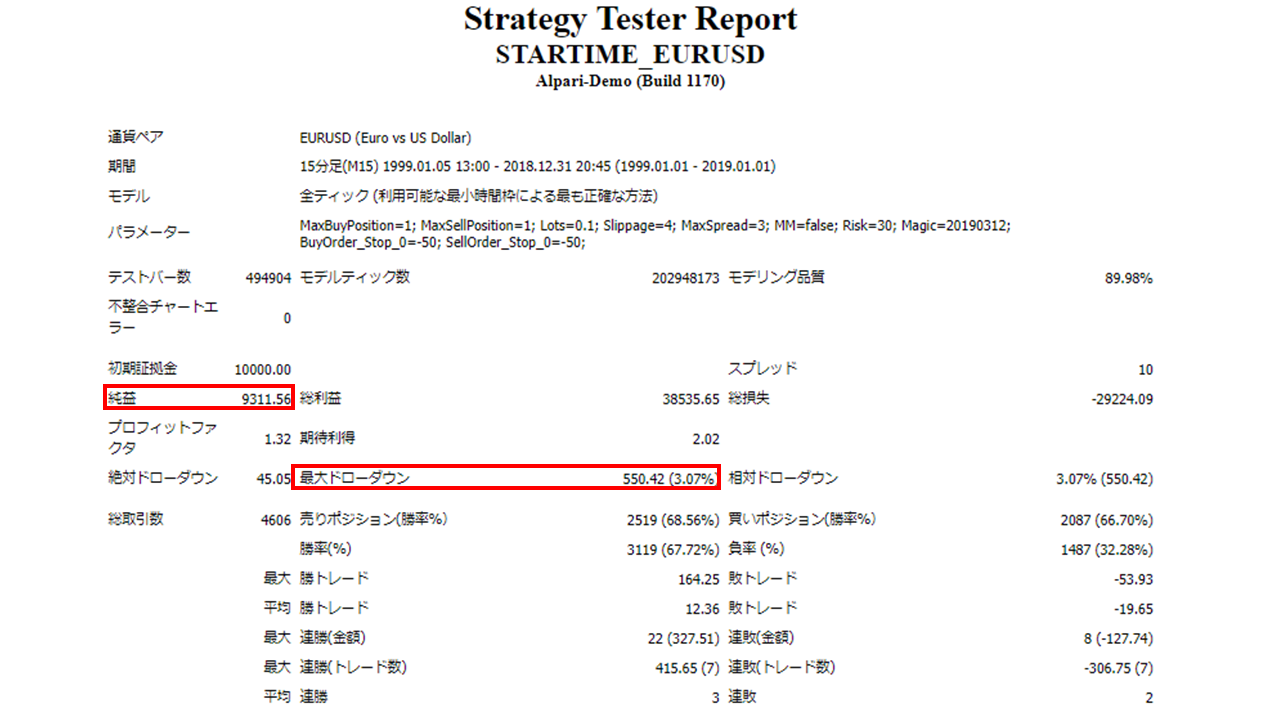 15分足を使用したユーロドルのEAで、最大ストップロスは50に設定されています。