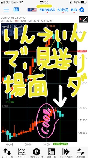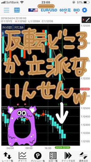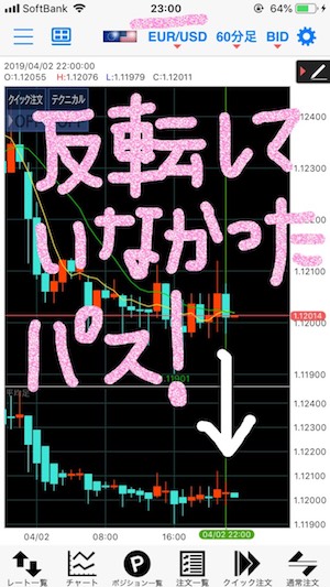 - 23時にユーロドルのチャートを開き、22時台の1時間平均足が反転している場合のみエントリー