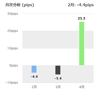 月次分析を見ると、2、3月の調子が悪かったようですが、4月は25.3pipsと絶好調です。