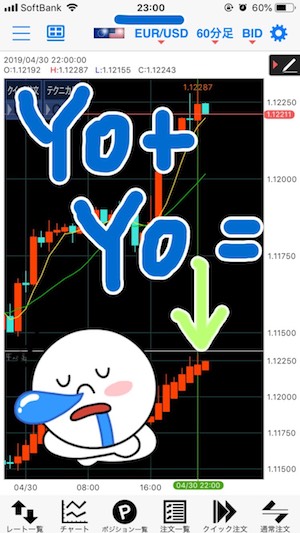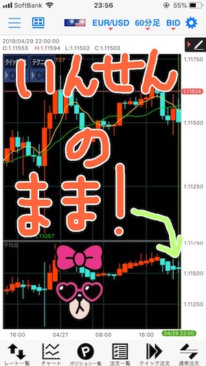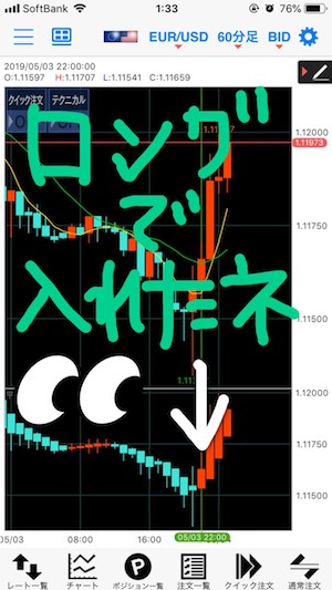 - 23時にユーロドルのチャートを開き、22時台の1時間平均足が反転している場合のみエントリー