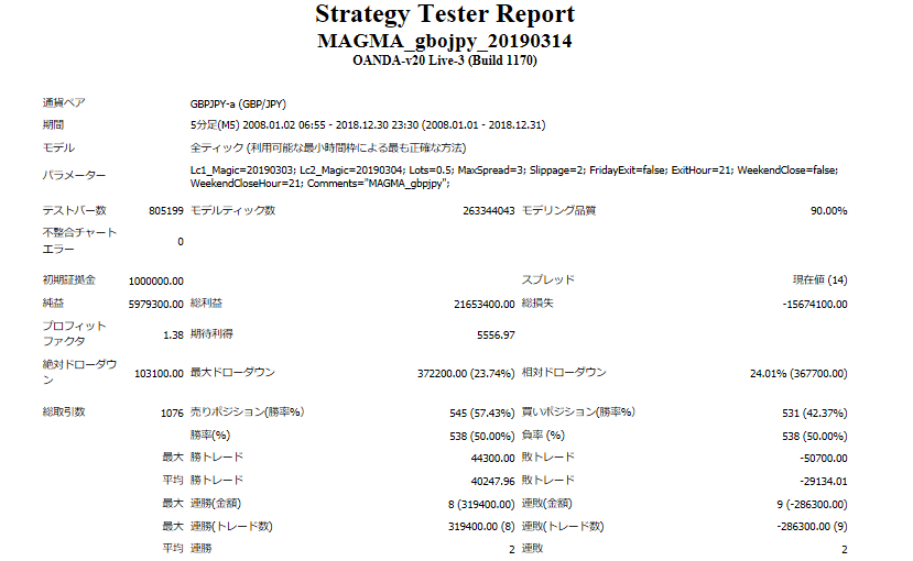 月別を見ると大きく利益を取っている月も多く、一方で月によっては大きく負けることもあるようです。トータルでは利益を出せているので、証拠金の管理をしっかりしていれば問題はなさそうです。