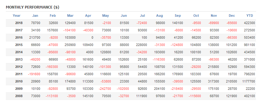 年別を見ると2009年にいったん落ち込んでいますが、2010年からは再び高い利益を挙げています。少しムラがありそうですが全体では、大きく獲得できています。