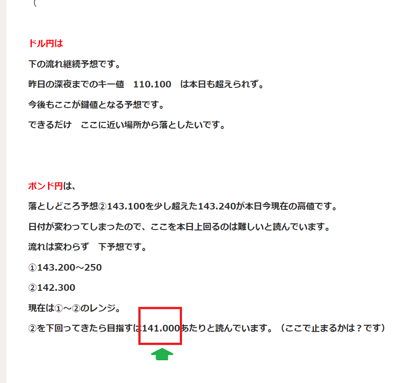 昨夜の最安値は、141.200 付近。週が変わっていての値なので、ほぼ ピッタリ! と言ってもいいのでないでしょうか?