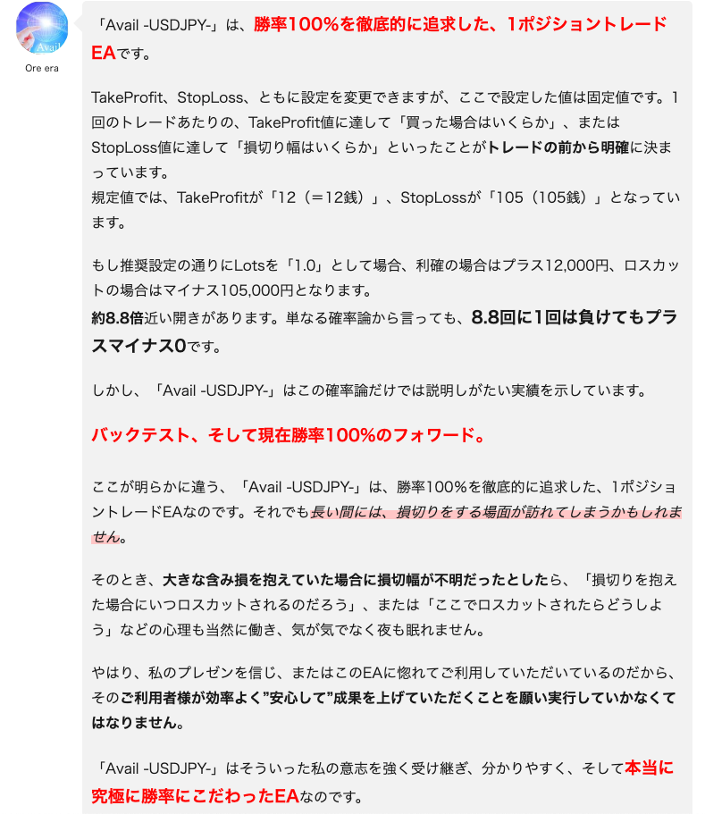 Avail -USDJPY-の評判と検証!Availの開発者 Ore eraさんにインタビュー!Availとは勝率100%を徹底的に追求した1ポジショントレードEA!