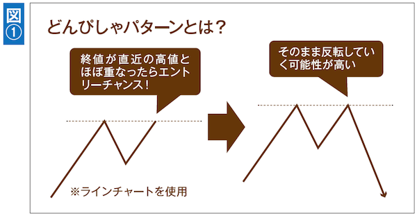 こんにちは、いいだっち先生です。前回は「相場の大衆心理学」について書きました。相場の心理はとてもシンプルで、誰もが「損をしたくない、得をしたい」ということです。それを言い換えると「高く売りたい、安く買いたい」ということになります。だからこそ直近の高値や安値は意識されやすく、そこで反転する現象が起こりやすいのです。どんぴしゃパターン(図①)も、その心理に基づいたパターンだといえます。
