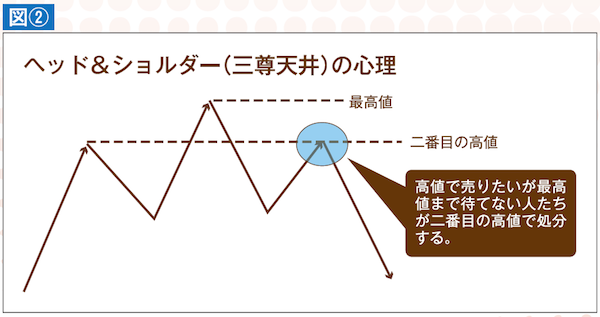 実はヘッド&ショルダーが発生する理由も前述した大衆心理「損をしたくない、得をしたい」、つまり「高く売りたい、安く買いたい」という基本心理から派生しています。いつでも思い通りに直近の高値で売れたり、直近の安値で買えたりしたら良いのですが、相場の世界は、そう都合よく行くことは稀です。そして早く現金化したい、ポジションを処分したいと焦っている人や直近の最高値や最安値まで待てない人たちは「二番目の高値や安値でいいからそこで処分しよう」と手放すのです。それがちょうど二番目の高値または安値のショルダー部分にあたります。こうやってヘッド&ショルダーが形成されるのです(図②)。