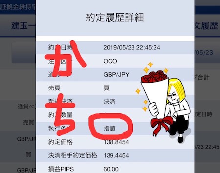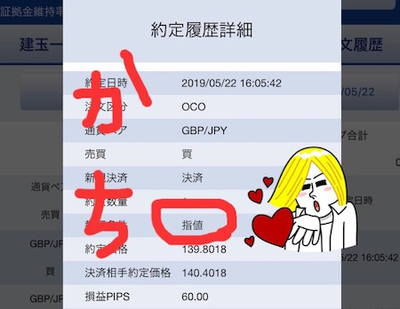 - 利益確定が60pips、損切りが−50pipsのOCO決済
