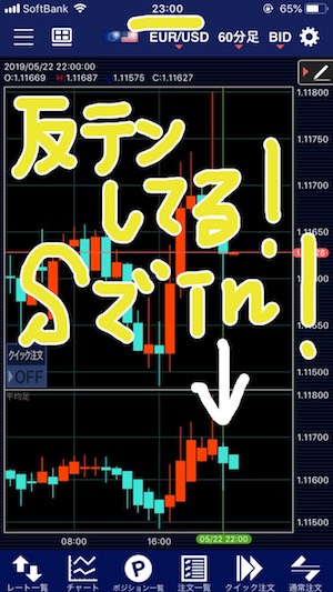 - 23時にユーロドルのチャートを開き、22時台の1時間平均足が反転している場合のみエントリー