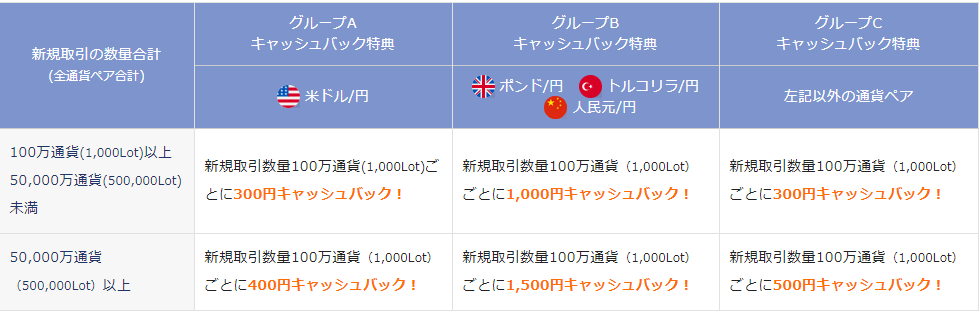 外為どっとコムでは現在、『外貨ネクストネオ』にて新規取引数量合計に応じたキャッシュバックキャンペーンを展開しています。条件は全通貨ペア合算で100万通貨以上の新規取引で、その内訳となるA~Cの通貨ペアグループの新規取引数に応じてキャッシュバックがされるというもの。さらに取引数量が合計50000万通貨に達すると、キャッシュバック金額が一律でグレードアップされます。注目すべきはキャッシュバック金額に上限はないという破格の内容になっています。