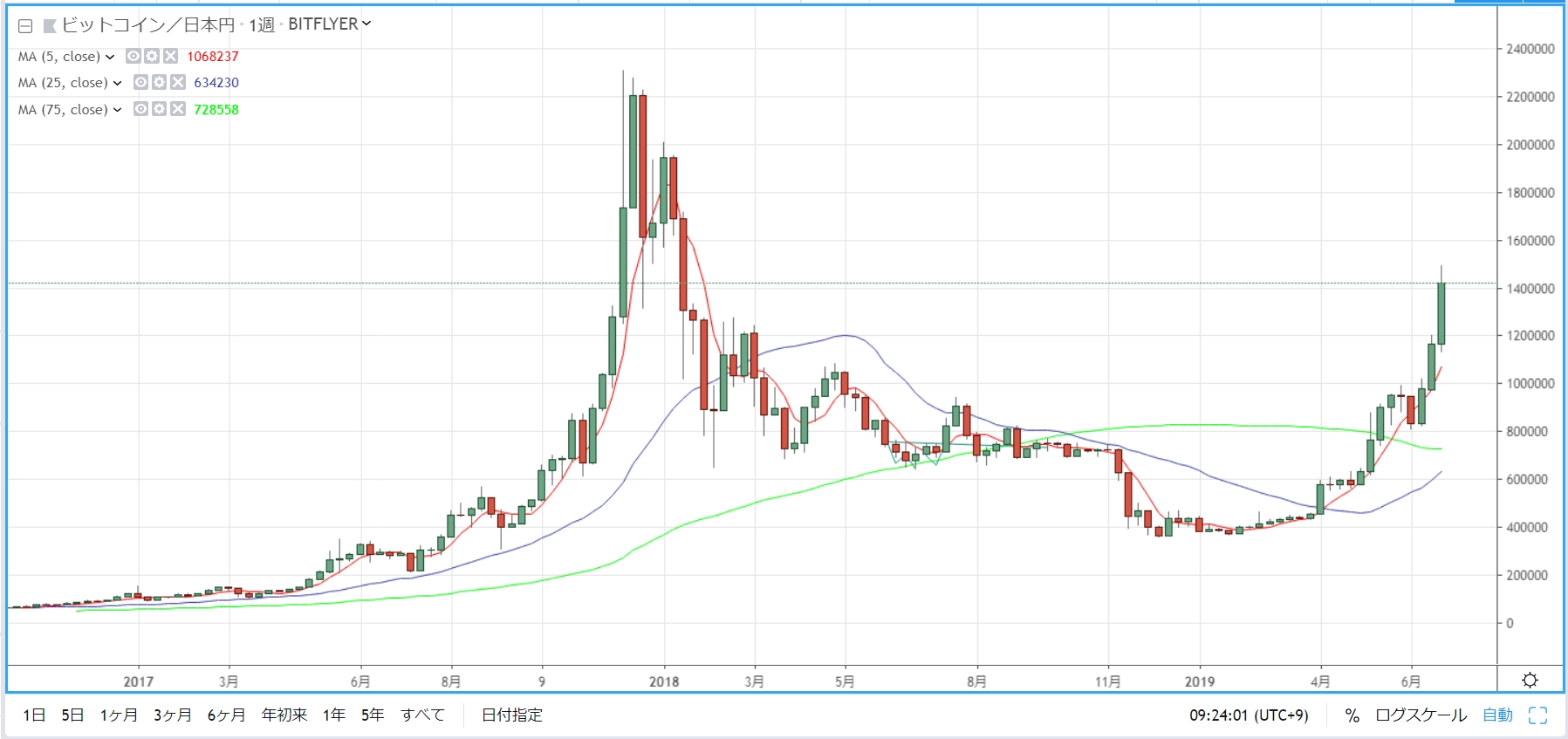 週足チャートを見ると、今年の4月から上昇し、この6月はかなり鋭角に続伸していることが分かります。この鋭角な上昇から思い出されるのが、2017年9月以降の上がり方。2019年9月の50万円から同年12月の230万円まで、一気に吹き上げました。当時は連日、ビットコイン価格上昇の報道があり、押し目を作ることなく、買いが買いを誘って上昇していきました。