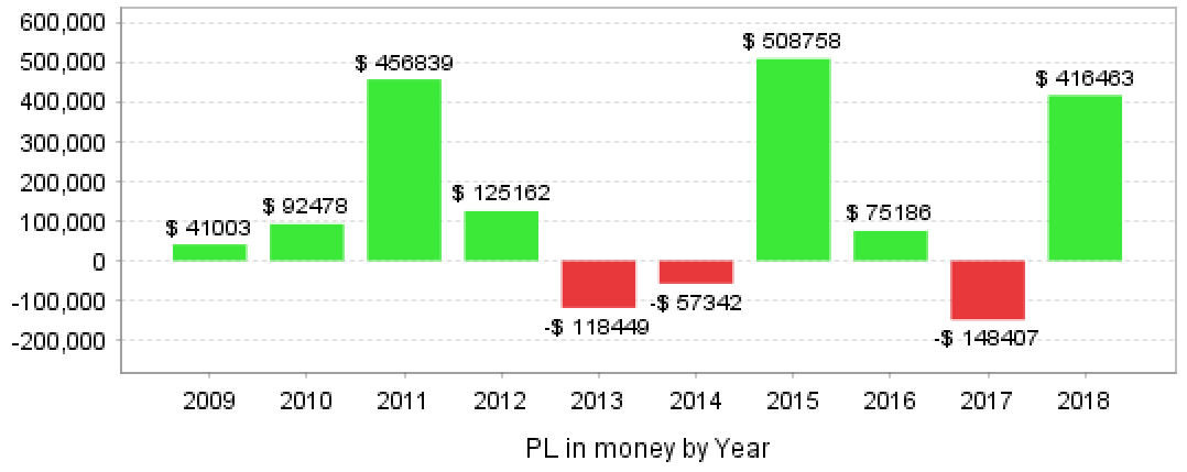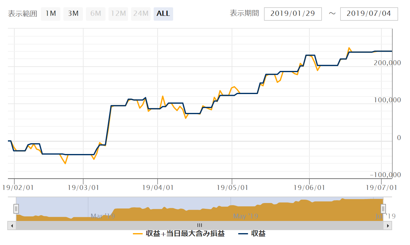 年間で40万円以上獲得した年が3年、損失だった年が3年と年単位では波のある挙動だと思われます。ですが、利益を出すときの幅が大きいのでトータルでしっかりと利益を出していくことができます。