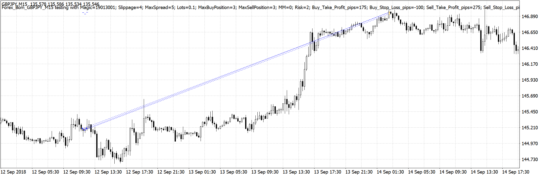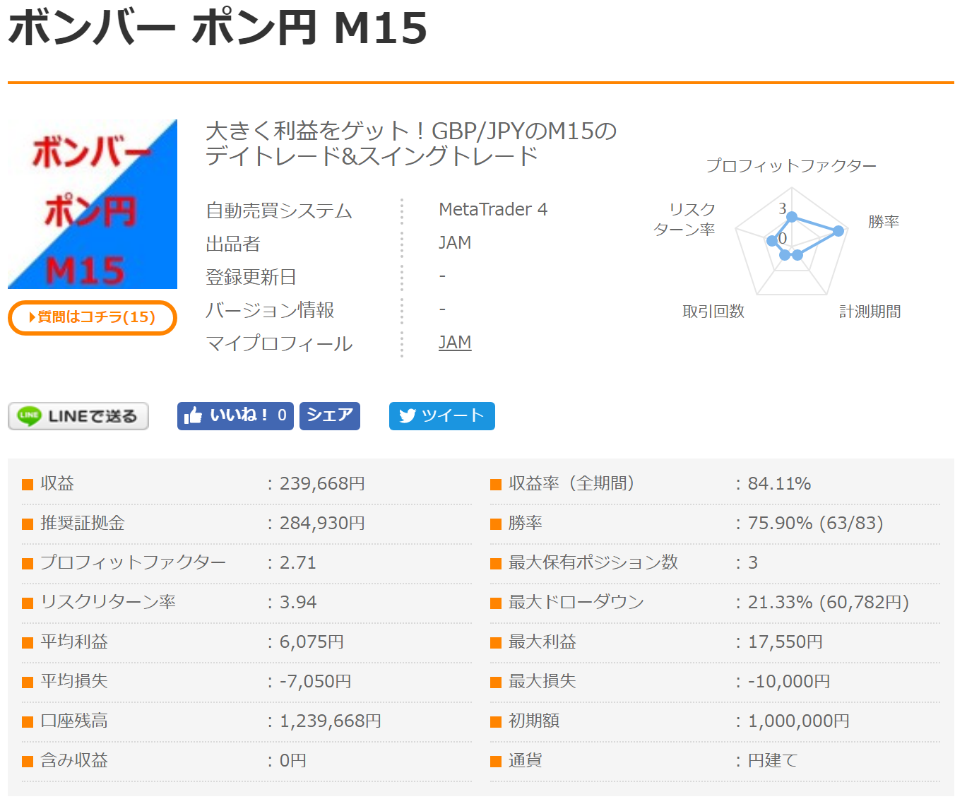 「ボンバーポン円M15」はポンド円を対象にした15分足のデイトレおよびスイングトレードタイプのEAです。