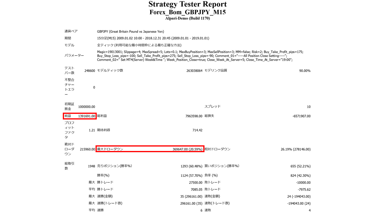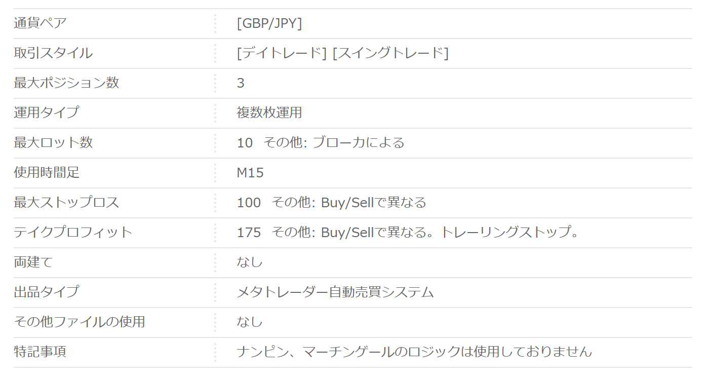 値動きの激しいポンドでデイトレ以上のポジション保有が最大3つあることを想定すれば、0.1ロットであっても100万円の資金から安全運用が想定できるのは堅牢なEAだといえます。