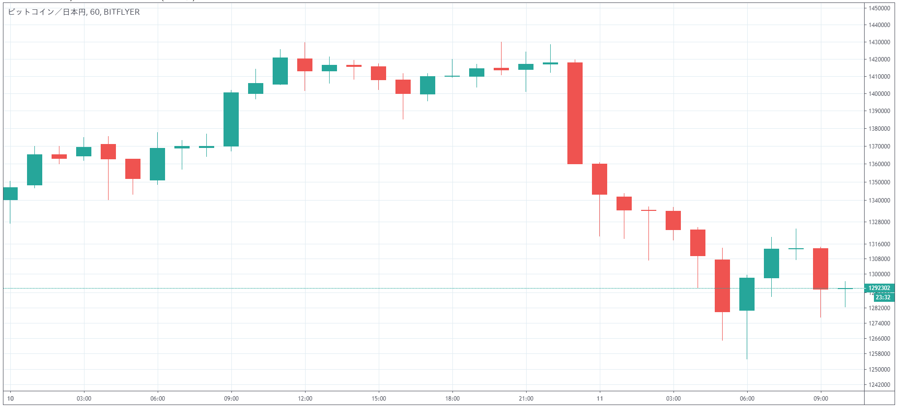 ・ビットコインは130万円を割り込み、129万円台で推移。
