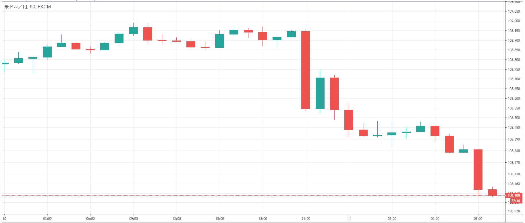 ・議会証言を受け、ドル円は108円台前半まで下落。108円台を割り込む可能性も。