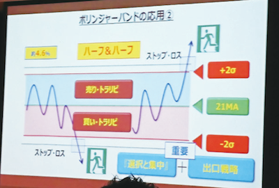 ▶ボリンジャーバンドで描かれる±2σのラインを活用してトラリピを仕掛けるタイミングを説明する津田さん。