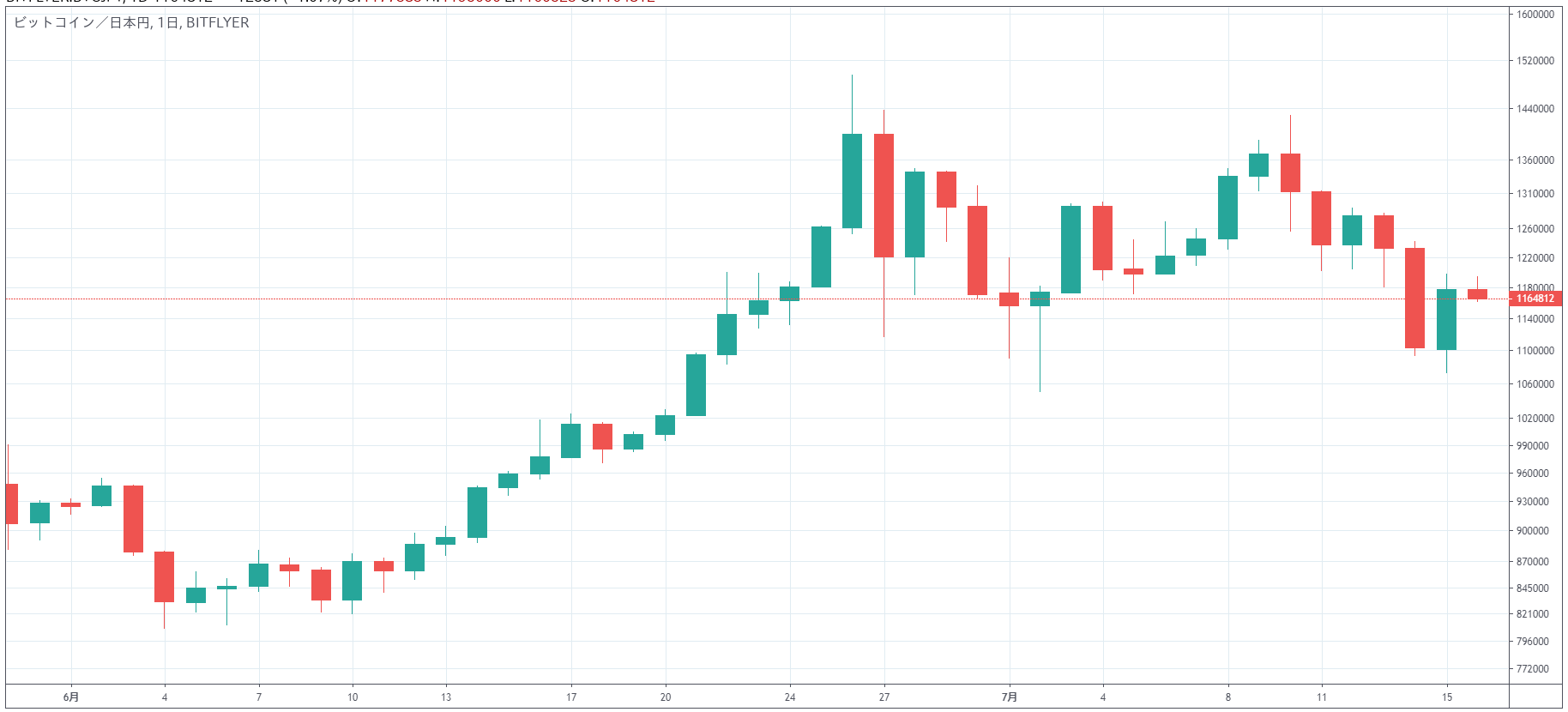 ・ビットコイン円は前日15日に一時110万円を割り込み、日足でダブルトップを形成!? 12時30分時点では116万円台で推移している。