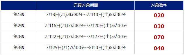 内容は、申込受付期間2019年7月8日~同年8月3日05時30分までの約1か月間を売買対象期間として4週に分け、各期間に設けられた対象数字と期間中の「SBI FXTRADE」での約定値段の下三桁(小数点以下第2位~第4位)が一致した人の中から各週抽選で10名に1万円相当のカタログギフトがプレゼントされるというものです。
