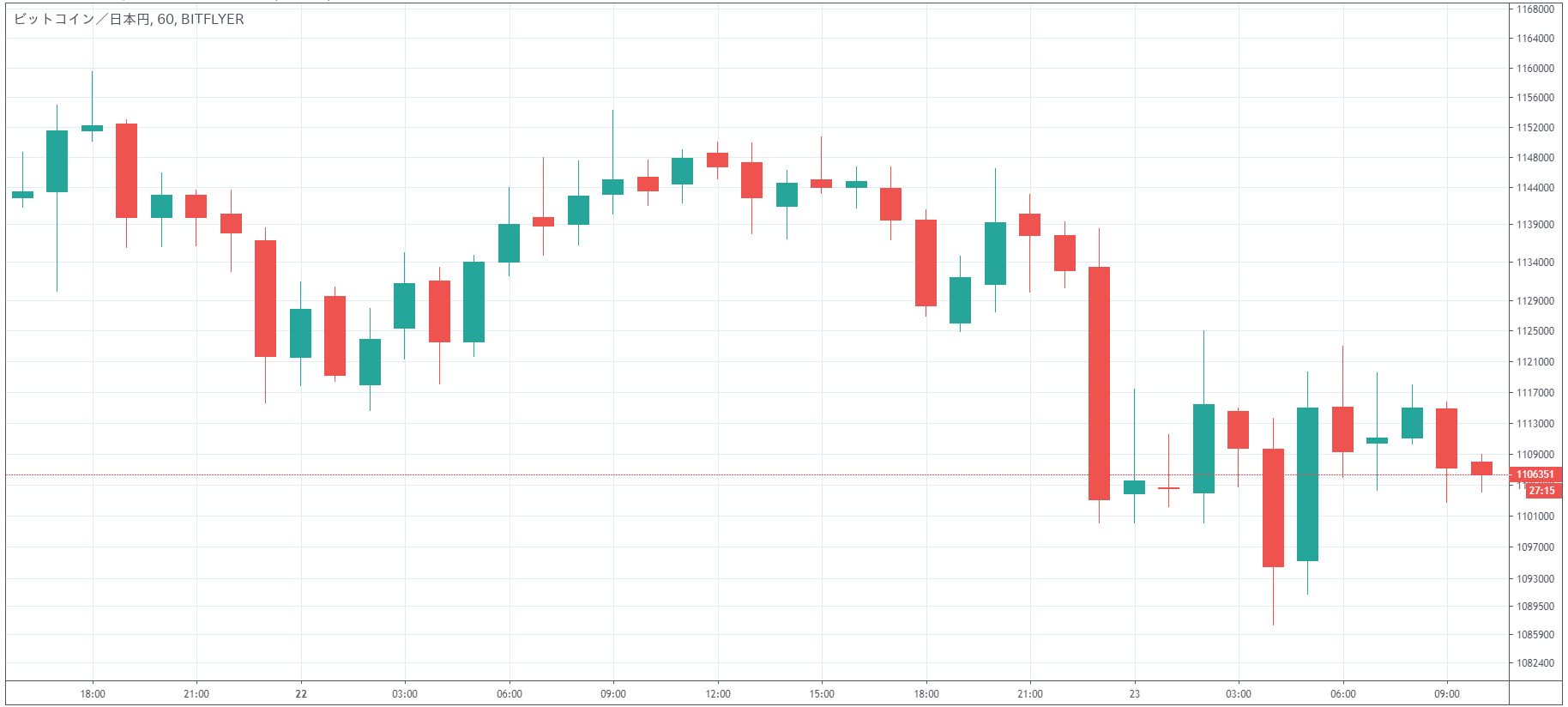 ・ビットコイン円は一時110万円を割り込んだが、その後はやや買い戻され、11時現在、110万円台前半で推移している。