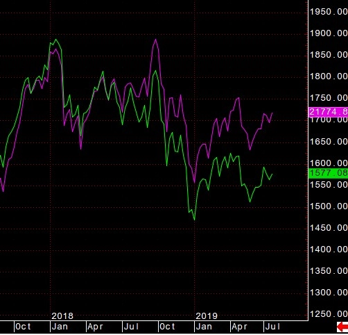 緑:TOPIX ピンク:日経平均