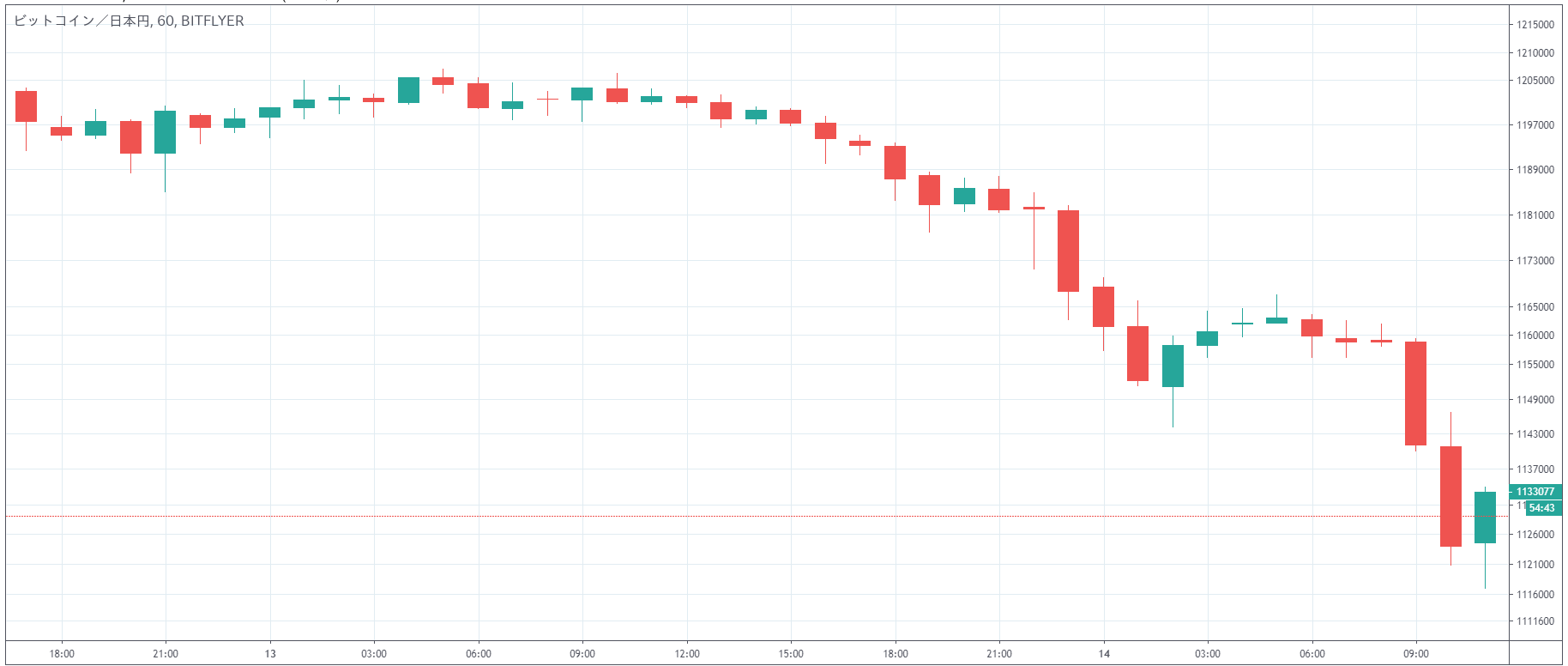 ・ビットコイン円は下落基調で120万円を割り込み、113万円台前半で推移。