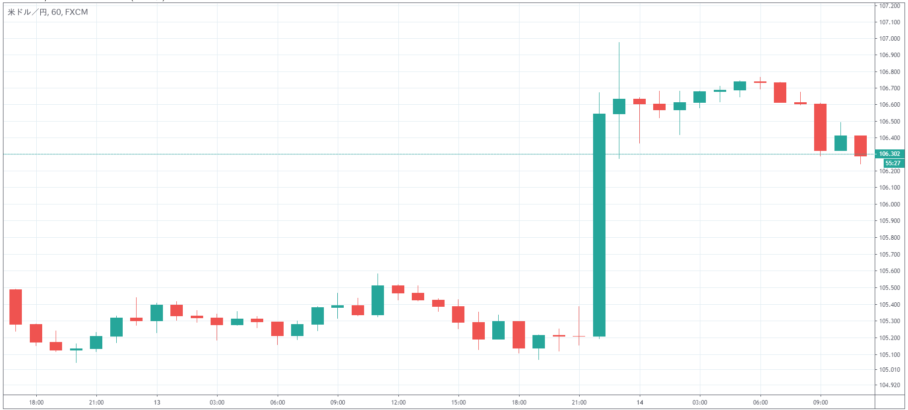 ・円安ドル高が進み、ドル円は106円台後半まで一気に上昇。その後、落ち着きを取り戻し106円台前半で推移している。