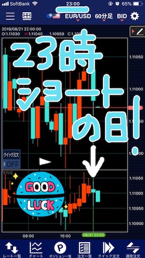 - 23時にユーロドルのチャートを開き、22時台の1時間平均足が反転している場合のみエントリー
