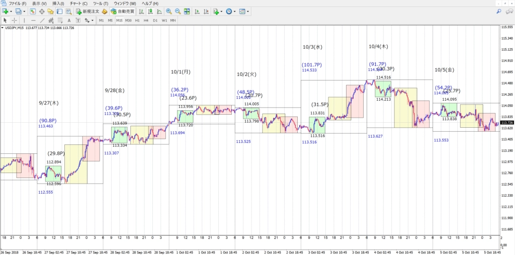 そんなゆずっこさんが、検証作業の効率化を図るべく開発したのが「検証が楽になるインジケーター」です。3大市場(東京・ロンドン・ニューヨーク)の高値安値、1日のボラティリティ、1週間のボラティリティなどを全て自動で表示してくれるインジケーターで、表示する項目をお好みでカスタマイズできる他、Macでも使えるという特長があります。